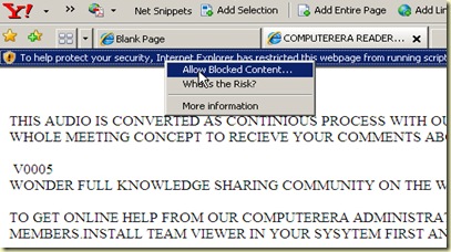 కంప్యూటర్ ఎరా పాఠకుల సమావేశం డిసెంబర్ 24 ఆదివారం కృష్ణకాంత్ పార్క్ లో జరిగిన విషయం తెలిసిందే. దానికి సంబంధించిన మీటింగ్ రిపోర్ట్, చిన్న వీడియో క్లిప్ ని కొద్దిరోజుల క్రితం పోస్ట్ చేయడం జరిగింది. మెమరీ కార్డ్ కరప్ట్ అవడం వల్ల ఆరోజు తీసిన ఫొటోలు పొందలేకపోయాం. అలాగే ఆరోజు 2.30 గంటల ఆడియో రికార్డ్ చేయడం జరిగింది. అది 132MB వచ్చింది. ఐపాడ్ లో రికార్డ్ చేయడం వల్ల అది పలు విధాలా ప్రయత్నించినా కుదించలేకపోయాం. చివరకు 23MB సైజ్ గల ఫ్లాష్ ఫైల్ గా మార్చగలిగాం. ఈ ఫైల్ ని ప్లే చేయడానికి ఎలాంటి థర్డ్ పార్టీ సాఫ్ట్ వేర్ అవసరం లేదు. సింపుల్ గా ఈ క్రింది లింకుల నుండి RAR ఫైల్ ని డౌన్ లోడ్ చేసుకుని లోపల ఉండే మూడు ఫైళ్లని డెస్క్ టాప్ మీదకు extract చేసుకుని V00005.htm అనే వెబ్ పేజీని ఓపెన్ చేయాలి. ఆ వెబ్ పేజీని ఓపెన్ చేసిన వెంటనే To help protect your security, internet exporer has restricted అనే మెసేజ్ ఒకటి పైన వస్తుంది. దానిపై మౌస్ తో క్లిక్ చేసి Allow Blocked Content అనే ఆప్షన్ ఎంచుకోండి. ఇప్పుడు అదే వెబ్ పేజీలో ప్లేయర్ వచ్చి ఆడియో ప్లే అవుతుంది. రెండున్నర గంటల ఆడియో ఉంది ఇందులో!